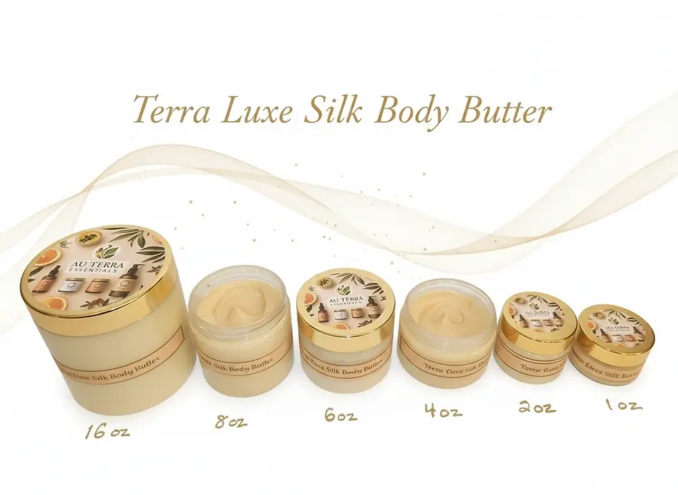 Discover Au Terra Essentials' luxury organic collection featuring therapeutic skin creams, nourishing hair growth formulas, artisanal aromatherapy candles, rich body butters, premium beard oils, and gentle facial exfoliants. Each product harnesses earth's precious botanicals with golden luxury craftsmanship, designed for diverse skin tones and ages 16-75. From healing and restoration to daily wellness rituals, experience where therapeutic excellence meets sophisticated indulgence.…